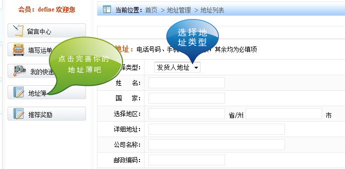 1,用戶登錄進入到會員中心之�,在左側(cè)的導(dǎo)航欄點擊“我的地址�”,就可以添加自己常用的發(fā)貨地址和收貨地址信息�